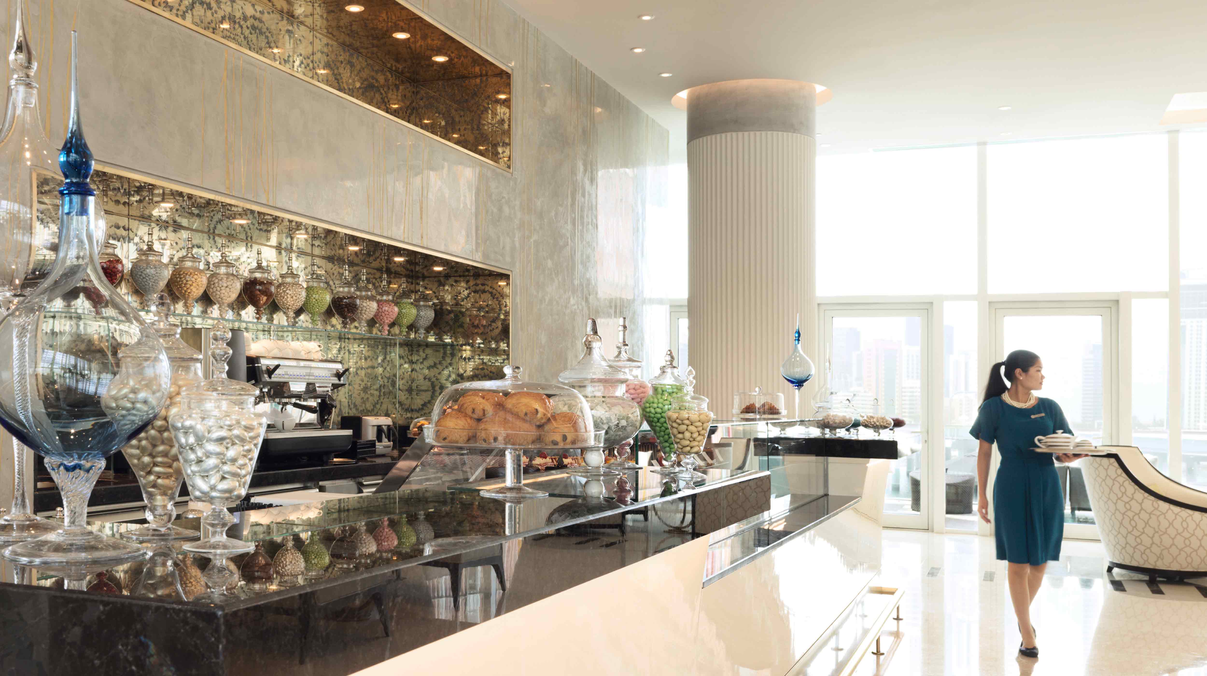 Al Meylas is Four Seasons Abu Dhabi at Al Maryah Island's bright, sophisticated lobby lounge, extending outdoors onto a waterfront terrace.