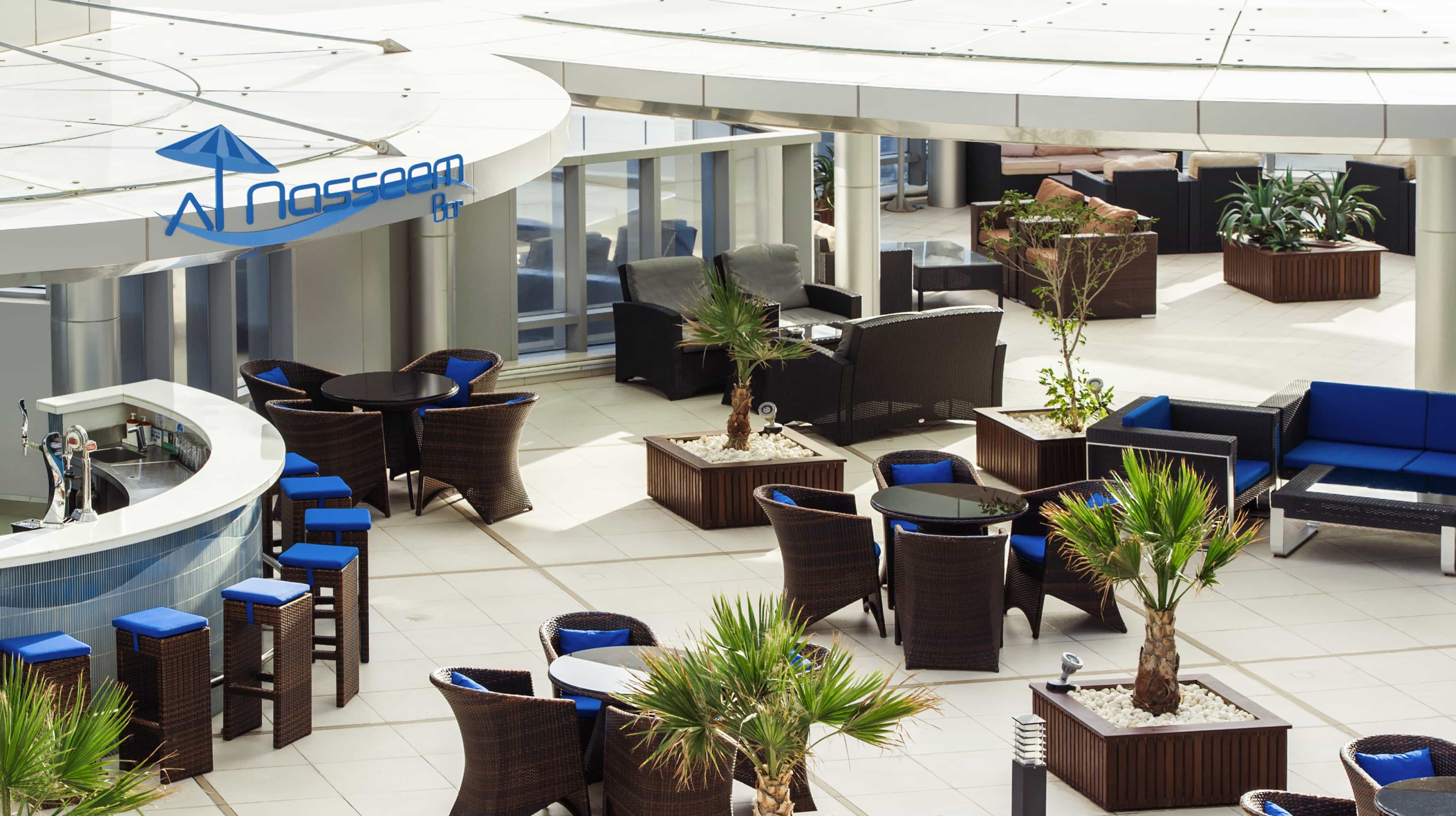 This modern and trendy pool bar, located on the second floor of the Novotel Abu Dhabi Gate Hotel, features snacks, all kinds of fancy drinks and a shisha lounge. There are many comfy sofas and seating options to relax and enjoy the pleasant views and weather. Poolside loungers can enjoy al fresco dining and refreshing summer-time and made-to-order beverages.